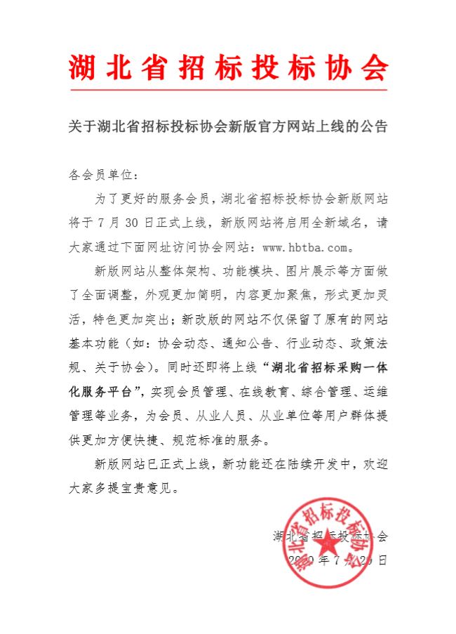 關(guān)于湖北省招標(biāo)投標(biāo)協(xié)會新版官方網(wǎng)站上線的公告