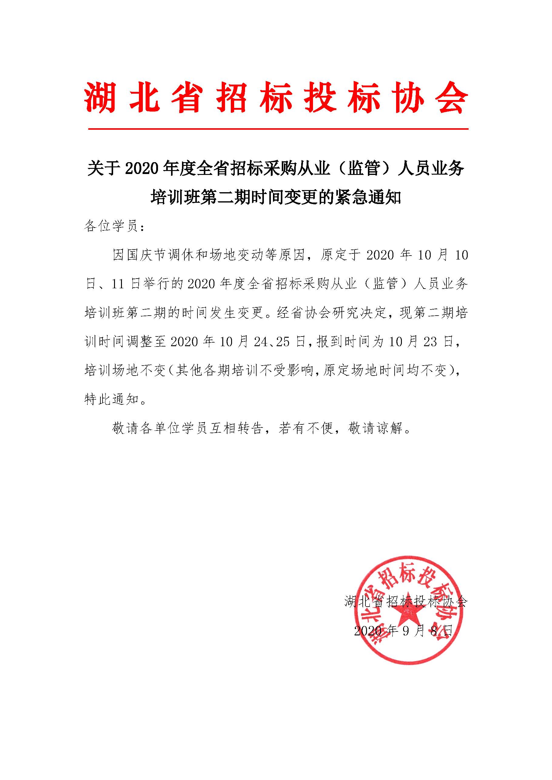 關于 2020 年度全省招標采購從業(監管)人員業務培訓班第二期時間變更的緊急通知