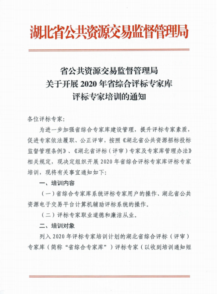 省公共資源交易監(jiān)督管理局關(guān)于開展2020年省綜合評標(biāo)專家?guī)煸u標(biāo)專家培訓(xùn)的通知