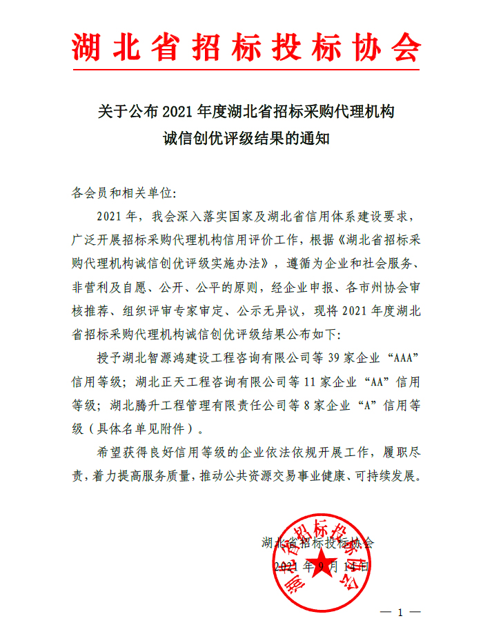 關于公布2021 年度湖北省招標采購代理機構誠信創優評級結果的通知