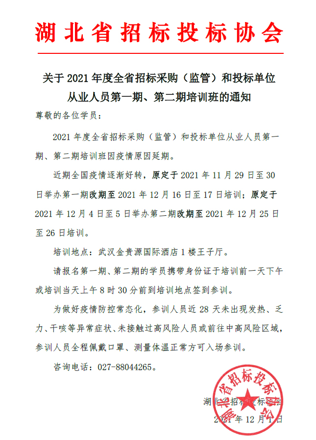 關于延期舉辦2021年度全省招標采購(監管)和投標單位從業人員業務培訓班的通知