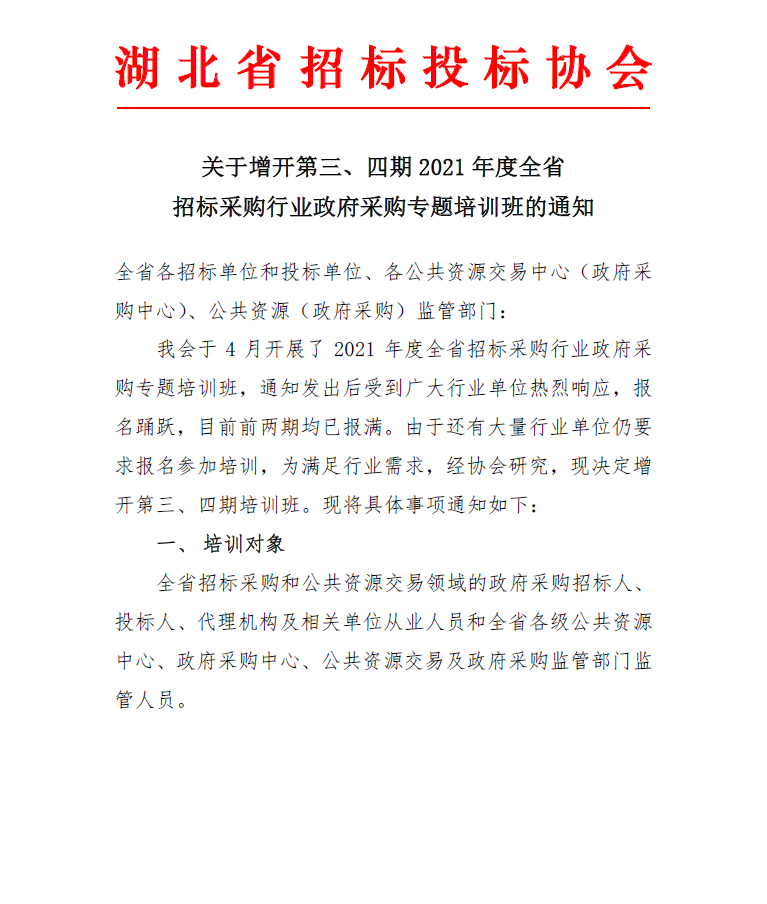 關于增開第三、四期2021年度全省招標采購行業政府采購專題培訓班的通知