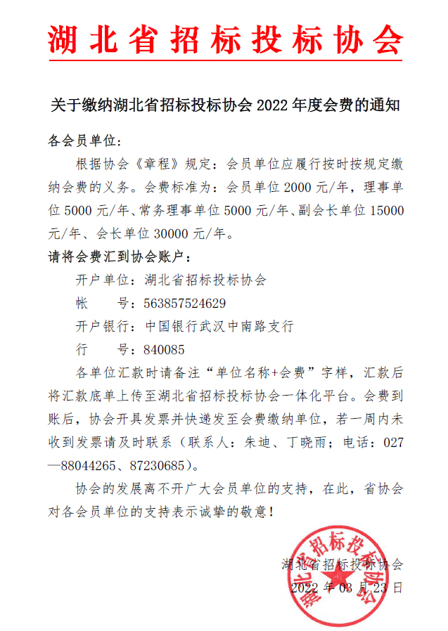 關于繳納湖北省招標投標協會2022年度會費的通知