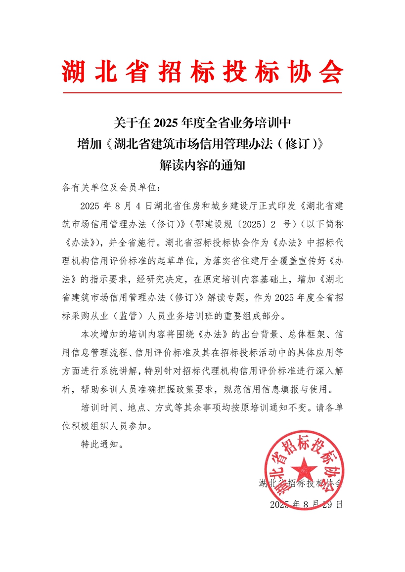 關于在2025年度全省業務培訓中增加《湖北省建筑市場信用管理辦法(修訂)》解讀內容的通知