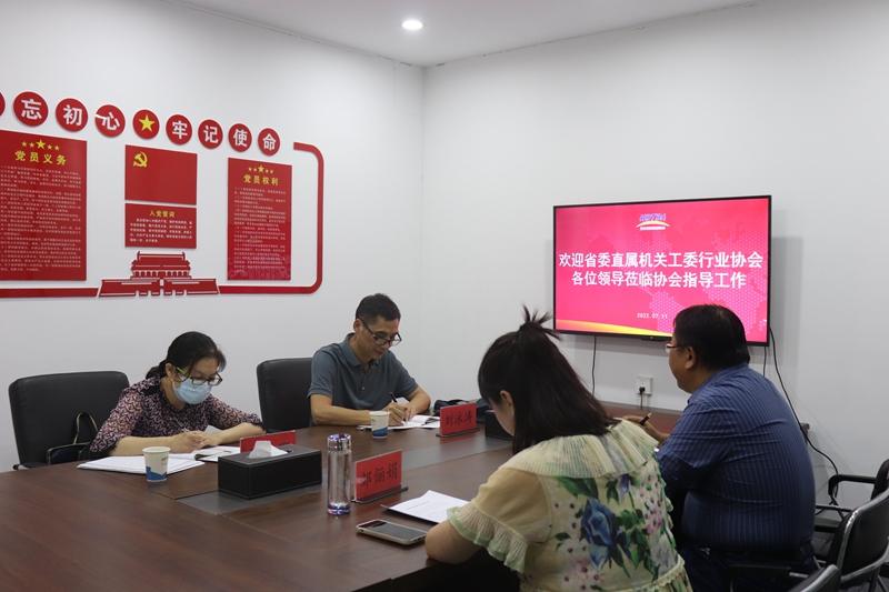 7月11日上午,省委直屬機關工委行業協會商會黨建工作處一級調研員劉泳濤、機關紀委書記王珩一行到我會調研并指導協會黨建工作。我會副秘書長辛峰、辦公室主任鄒儷娟參加調研活動。