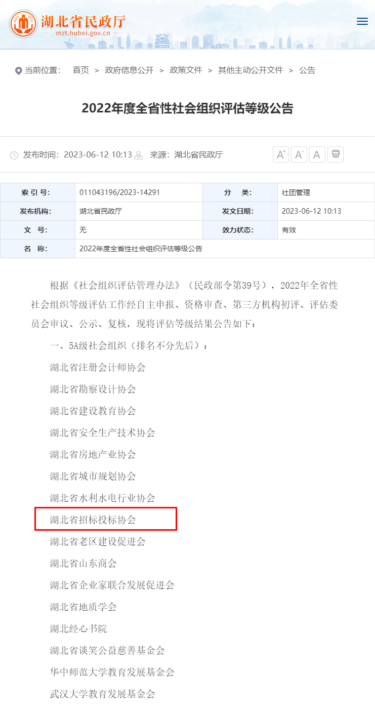近日,湖北省民政廳發布《2022年度全省性社會組織評估等級公告》,湖北省招標投標協會被評為5A級社會組織。我會首次參評即獲此殊榮,成為16家2022年度全省性5A等級協會之一!