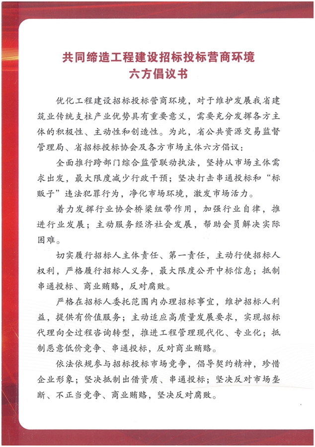 9月1日,省公共資源交易監(jiān)督管理局、省招標(biāo)投標(biāo)協(xié)會、招標(biāo)人代表、投標(biāo)人代表、招標(biāo)代理公司代表、評標(biāo)專家六方市場主體代表在南漳縣召開的“全省工程建設(shè)招投標(biāo)領(lǐng)域?qū)m?xiàng)整治現(xiàn)場推進(jìn)會”中80余人見證下共同簽署了《共同締造工程建設(shè)招標(biāo)投標(biāo)營商環(huán)境倡議書》。